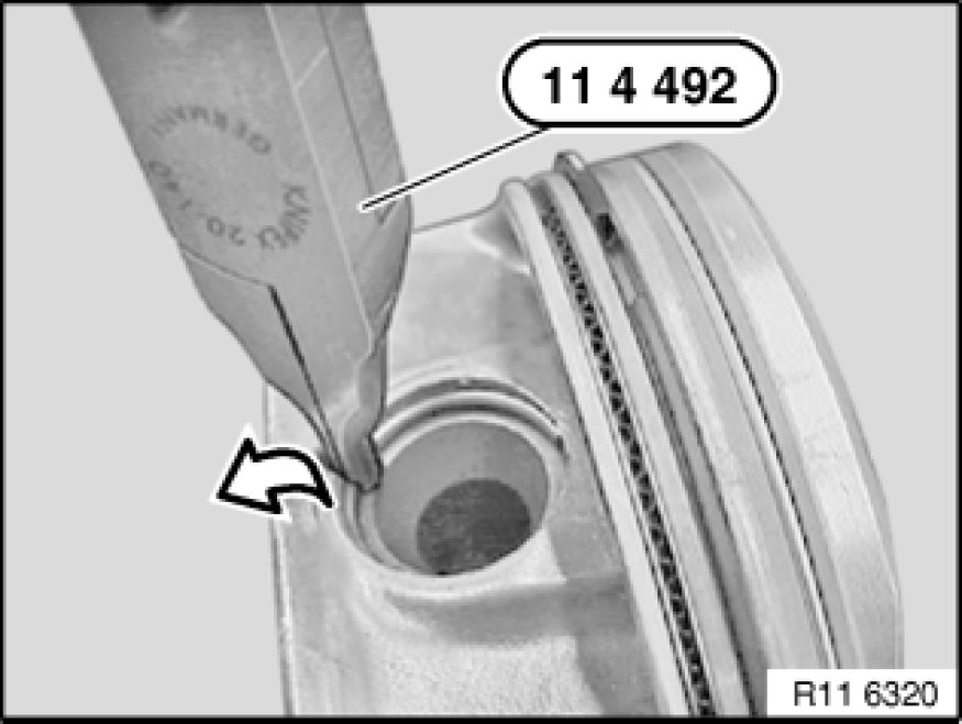 Lever out circlip with special tool 11 4 492 in direction of arrow and press out piston pin.