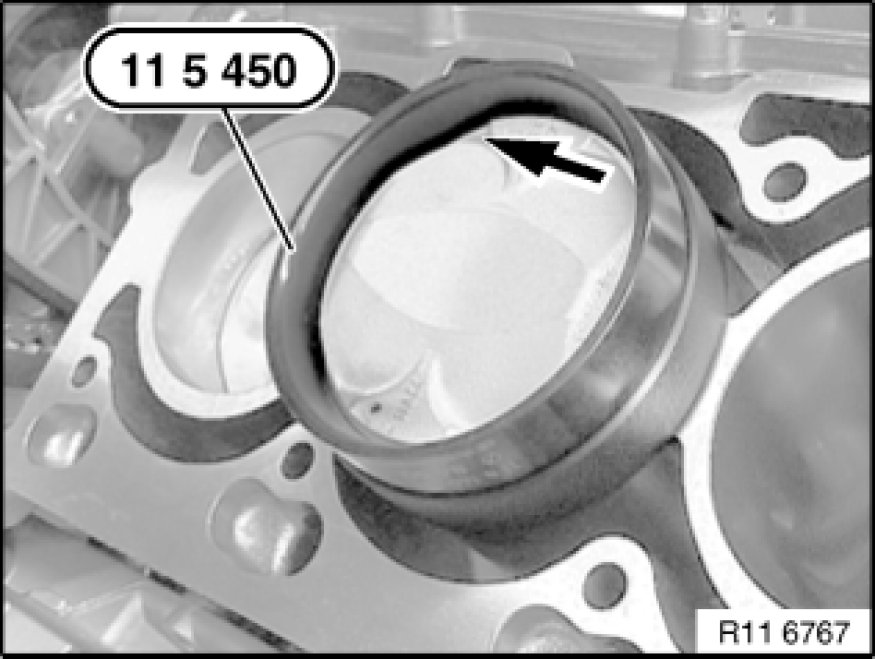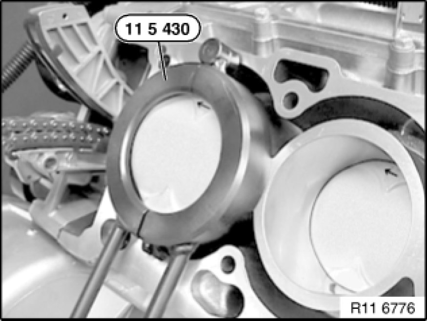 Prepare piston with rings with special tool 11 5 450 11 5 450 Mounting Sleeve.