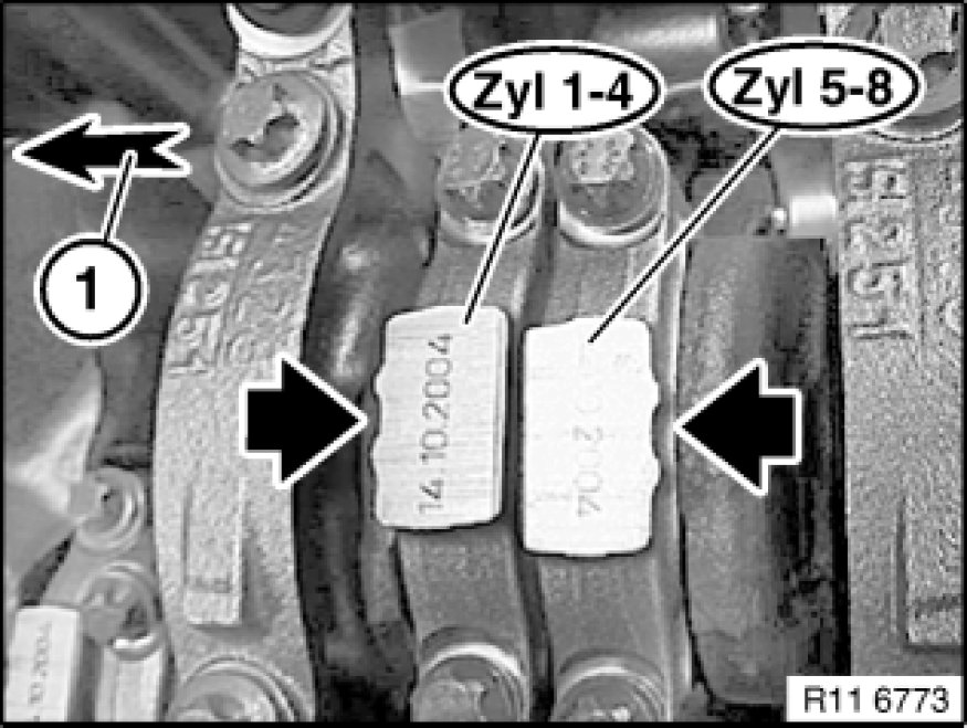 Conrod of cylinder 5 to 8 is installed in direction of travel, see arrow (1), rear.