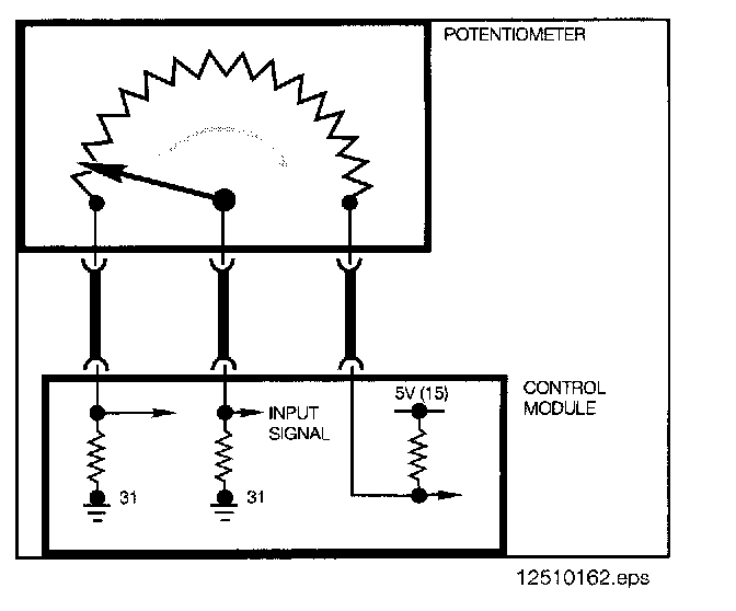 A Potentiometer (pot.) is a variable resistor capable of changing resistance values. Potentiometers have three terminals. One of the terminals is supply voltage, usually 5 volts. One of the terminals is the control module ground, and the third terminal is for the input signal into the control module. (Output from the Pot.) Potentiometers are used to measure mechanical movement. (e.g. Vane air flow meters, Throttle position sensors and Pedal position sensors.)