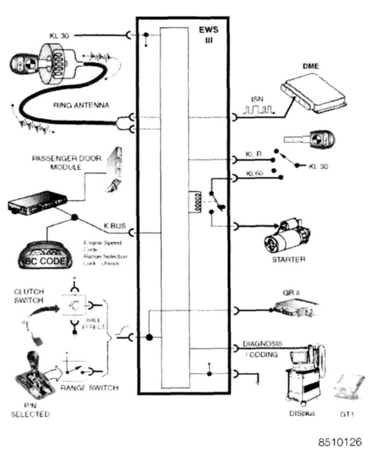 - As the starter begins to operate, the EWS III module sends the SN to the DME and if verified as correct by the DME, drive away protection is cancelled and injection and ignition is enabled. The EWS III module also sends a new changing code to the key transponder through the ring antenna.