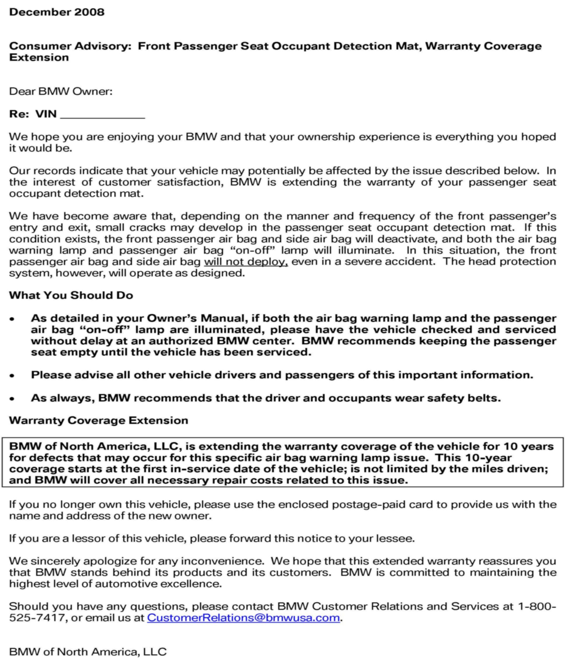 Campaign - Air Bag Warning Lamp For OC3 Seat Mat Fault