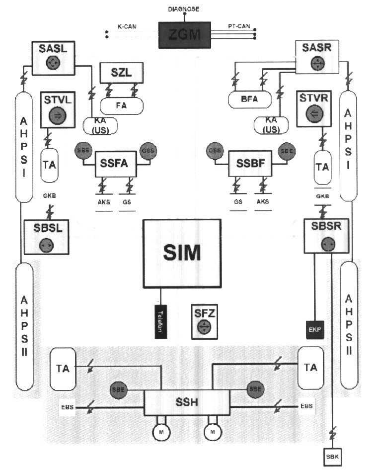 The ISIS system consists of the Safety Information Module SIM and several control units, called satellites, that are linked across the byteflight bus. In the case of the MRS system there was only one central control unit. On the E65/E66,the acceleration sensors are integrated into the satellites.