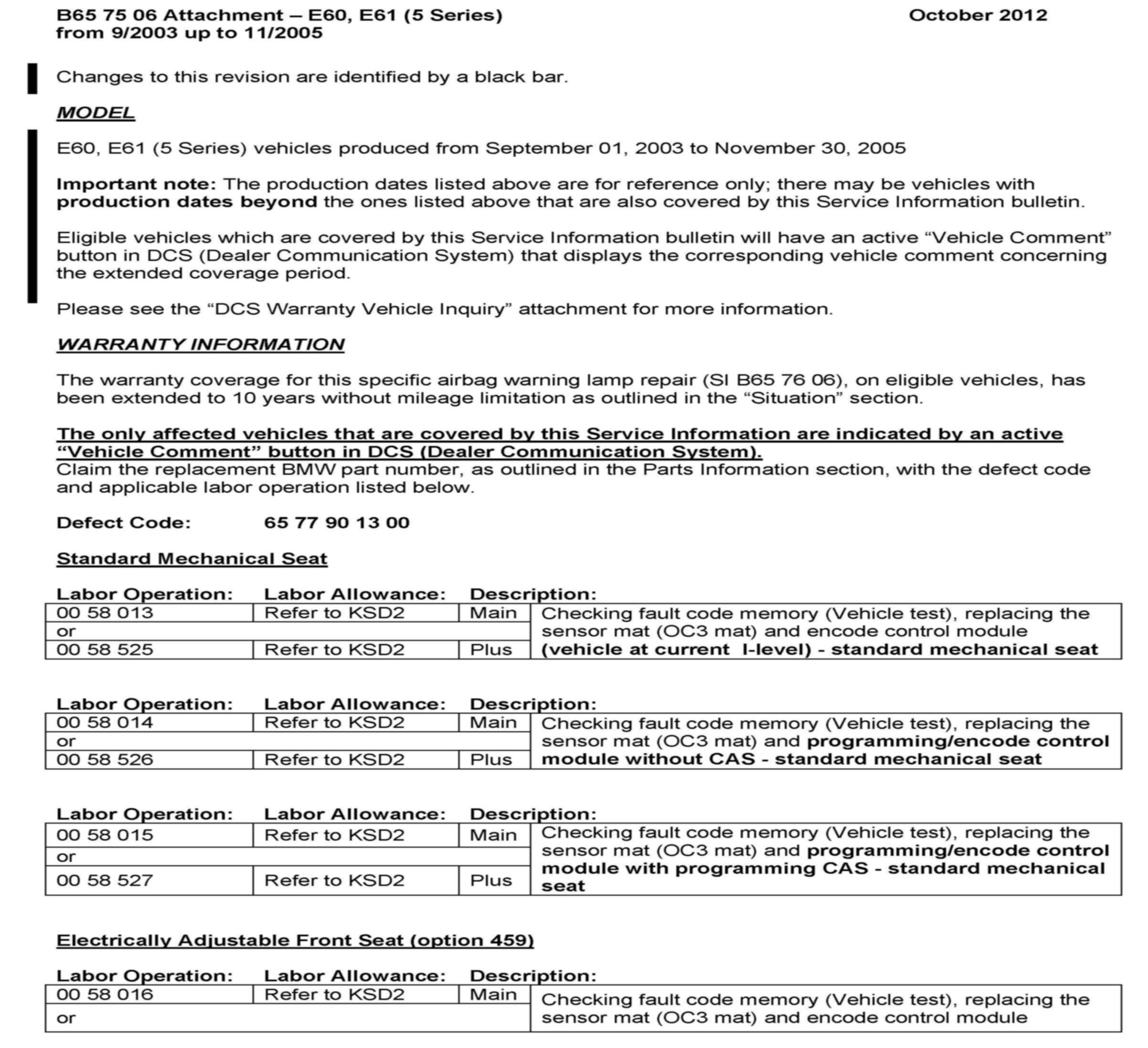 Campaign - Air Bag Warning Lamp For OC3 Seat Mat Fault