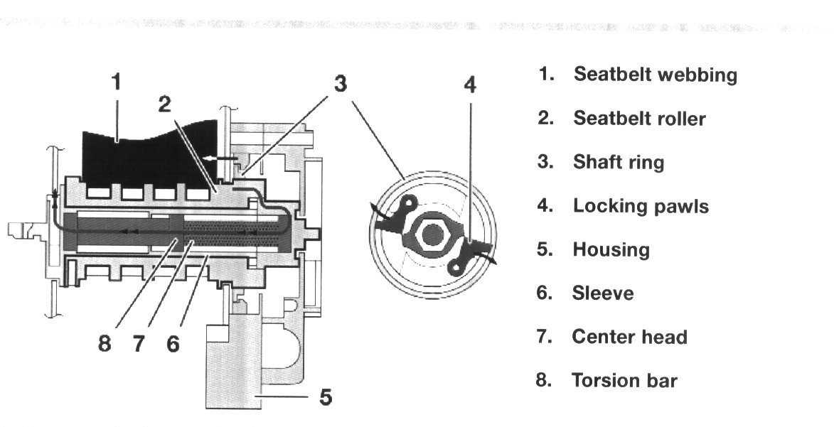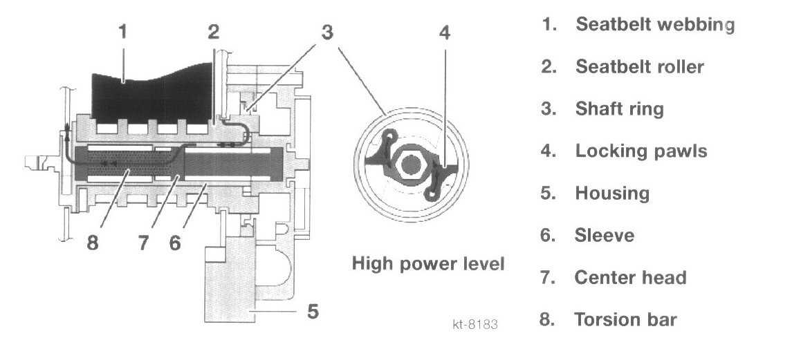 If the seatbelt roller is turned relative to the fixed torsion bar, the force is transferred to the thicker part of the torsion bar. This produces the high power level. This is the function of a normal emergency locking retractor.