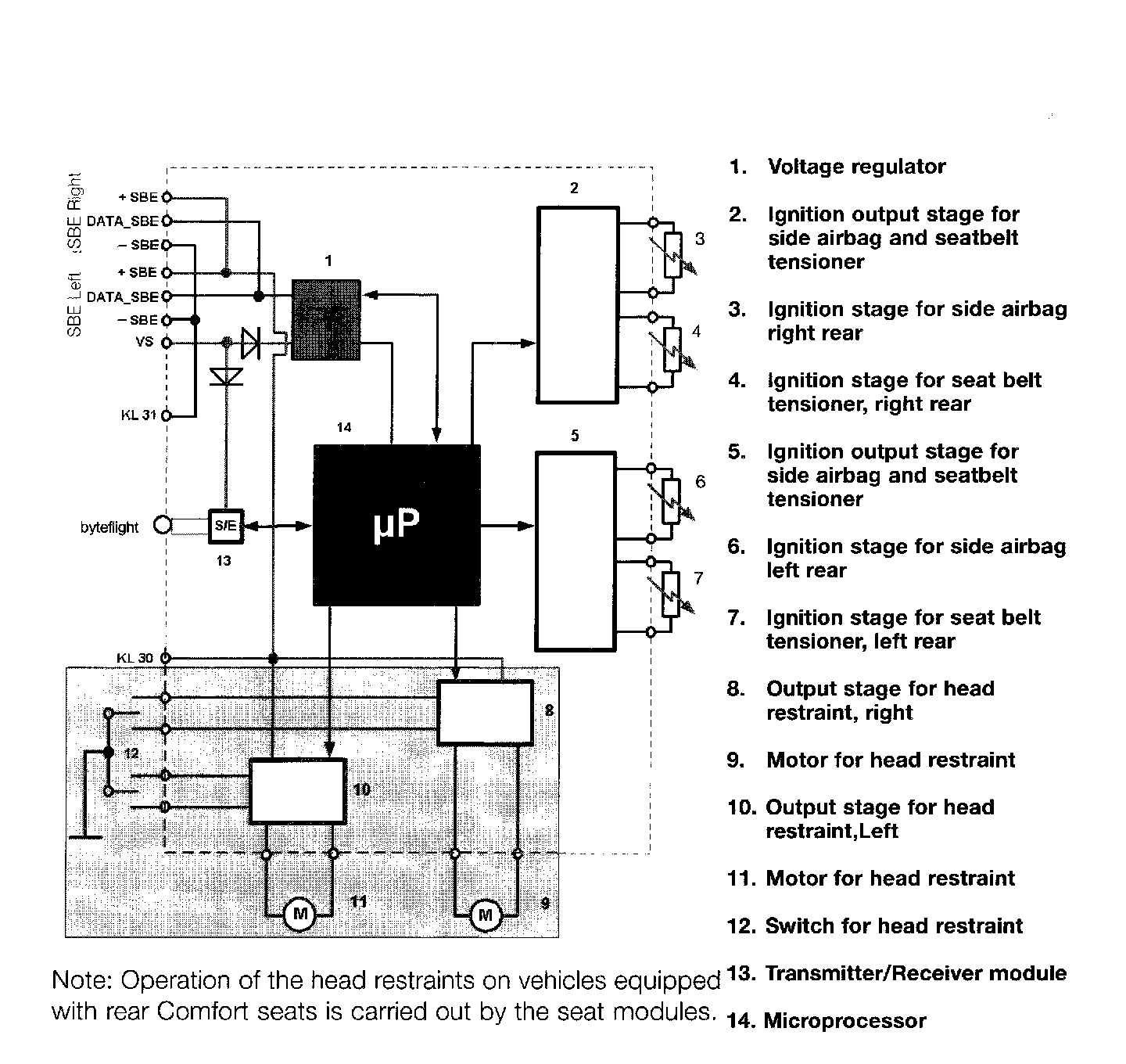 The seat satellite, rear is responsible for deploying the left/right rear passenger airbags and seatbelt tensioners. Additionally if the vehicle is equipped with basic seats the SSH is responsible for controlling the electric rear head restraints.