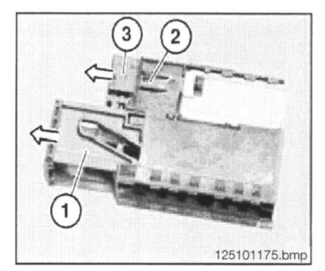 - Remove contact carrier (1) with MQS contacts from radio plug. Raise lock (2) on radio plug. Pull contact carrier (3) out of radio plug (Fig. 22/3).