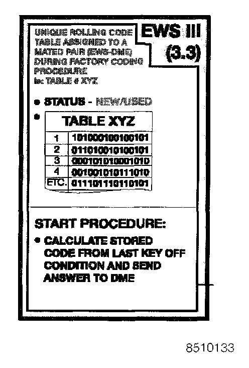 The "Rolling Code" will be different each time the start operation is begun. The "Codes" are taken from the "Rolling Code Table" which is assigned at the factory to the EWS III(3.3) control module and the DME.