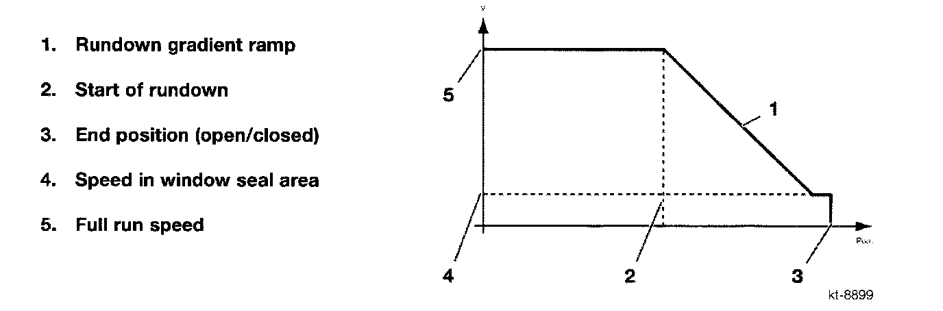 Smooth rundown describes running down of the power windows with a linear decrease in the infinitely variable speed until the window is at a standstill. This function is used when approaching the end positions (in both automatic and manual operation) of the lower and upper stops.
