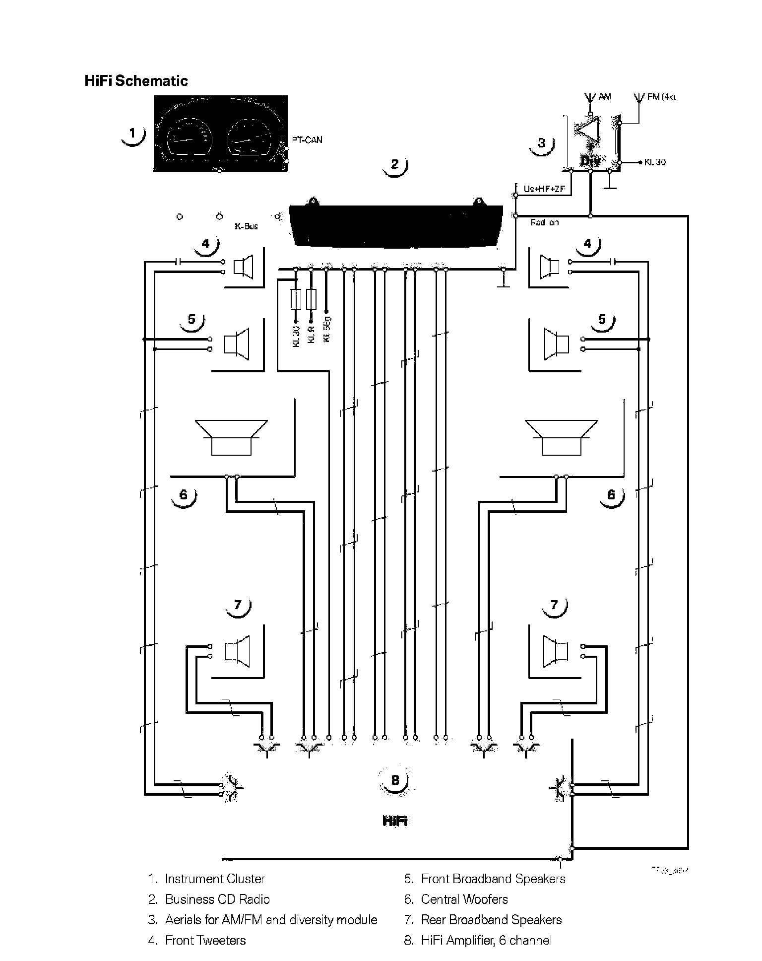 The HiFi audio system features a 6 channel analogue amplifier that is connected directly to the 4 speaker outputs of the radio. The loudspeakers are connected to the 6 HiFi amplifier out channels. The tweeters are protected from overload by capacitors in the supply lead and connected in parallel to the broadband speakers.