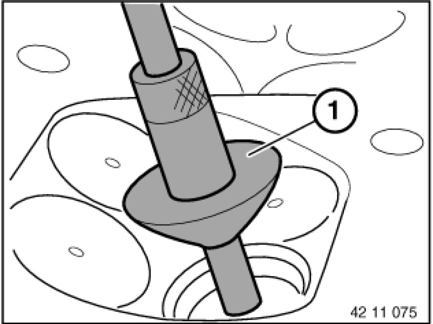 Assemble reaming tool and guide taper (1) from special tool kit 00 4 210 00 4 210 Seat of Reamers with Guide Cones 6, 7 and 8 mm depending on stem diameter. Press guide taper (1) onto valve seat. Starting from combustion chamber side, ream valve guide dry. Rotate reaming tool once in downwards direction.