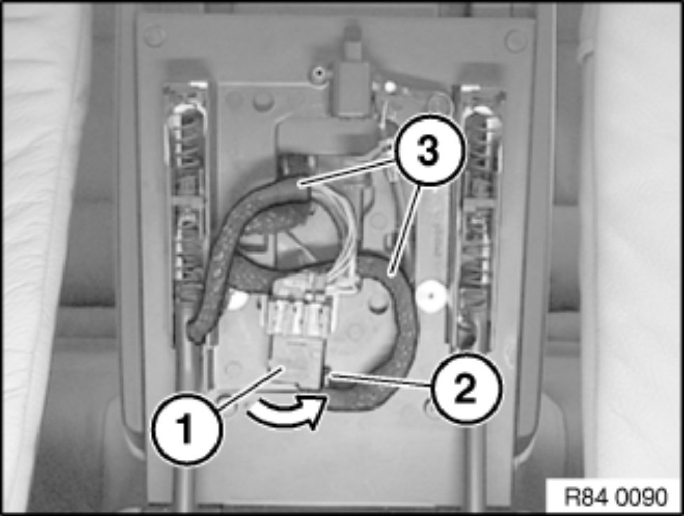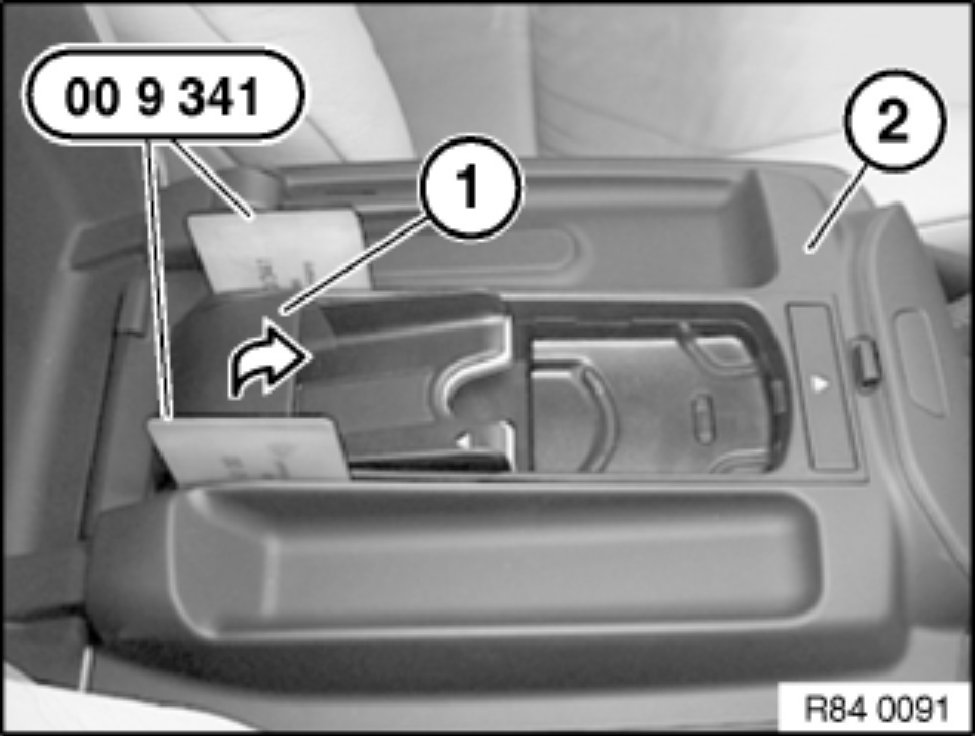 Feed out wiring harness underneath and remove eject box (1) from armrest function carrier (2).
