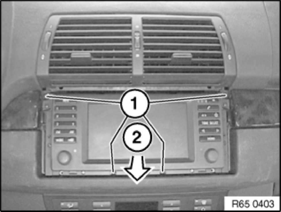 Unclip frame of on-board monitor (1) in direction of arrow and remove.
