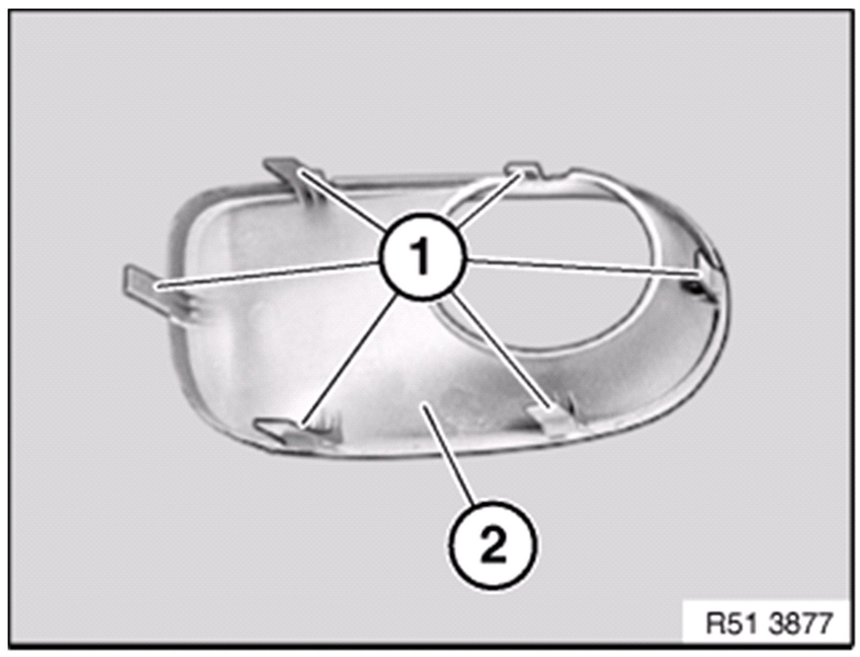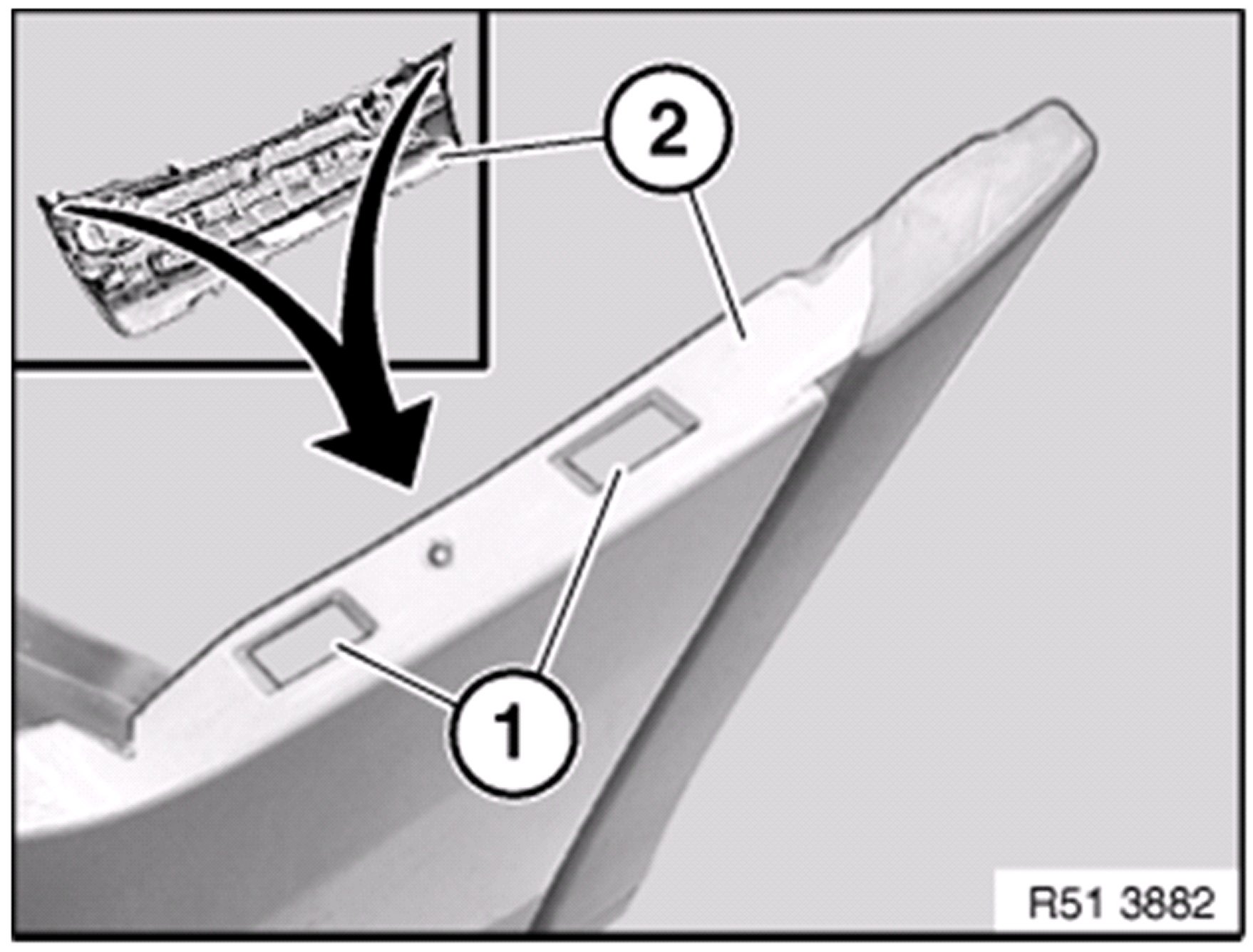 Tabs ( 1 ) on bumper trim ( 2 ) must not be damaged.
