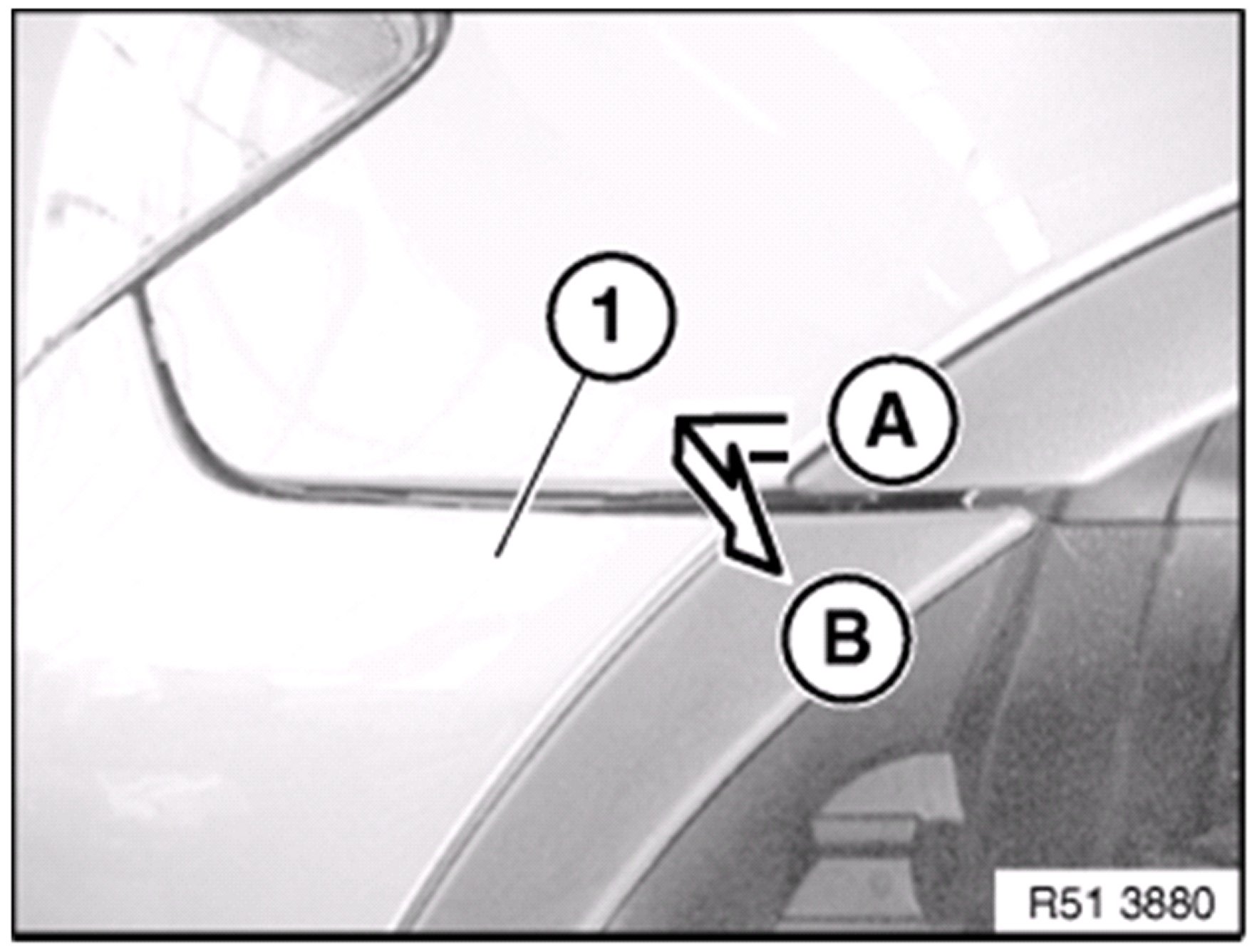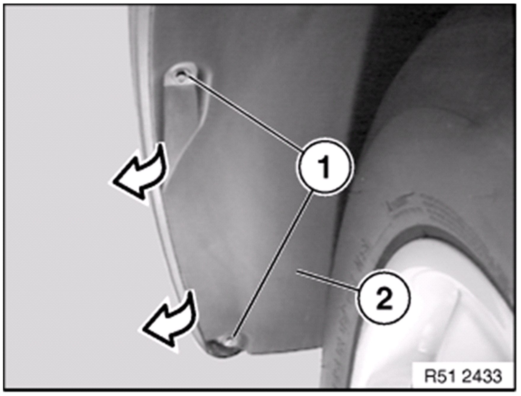Release screws ( 1 ) on left / right and lift out wheel arch finishers ( 2 ) at side.