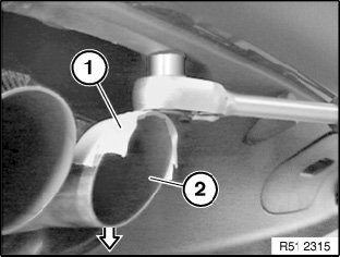 Pull tail pipes (2) downwards and release screw with commercially available Torx T55 and ratchet.