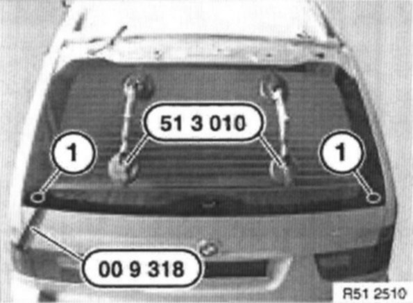 Mount special tool 51 3 010 on rear window (as far outside as possible) (moisten suction surfaces).