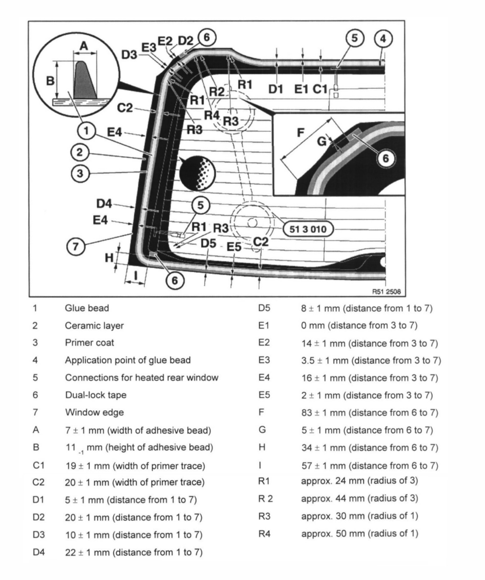 Attach special tool 51 3 010 to tool trolley twice. Moisten suction surfaces and secure rear window from outside. When reusing old rear window, remove residual adhesive down to 0.5 mm and replace upper dual-lock tapes.