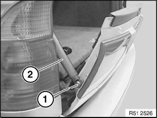 CAUTION: When second support (2) is released, protect rear bumper by supporting rear lid.