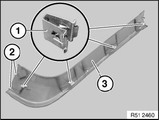 Using special tool 00 9 317, lever out side trim (1) on left/right with clip (2) from retainer (3) in lower trim (4).