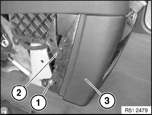 Unclip clips (1) on left/right with carpet (3) outwards from center console (2).