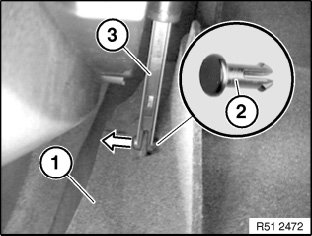 Raise glovebox (1) a little and detach pin (2) from retaining strap (3).