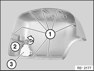 Turn mirror cap (1) forwards/upwards and remove from mirror foot (4).