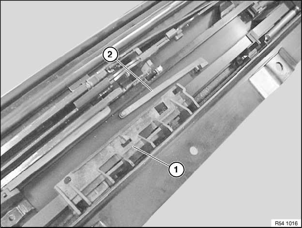 Continue sliding rear connecting link (2) with drive cable plate (1) towards rear out of guide channel and remove in succession.