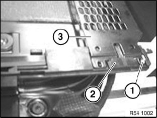 Raise floating roofliner (4) and remove over control rail (3) in direction of arrow (2).