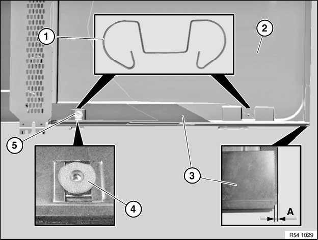 Adjust gap A = 3(±0.2) mm from control rail (3) to floating roofliner (2). Make sure washer (4) is correctly positioned with turning lock.