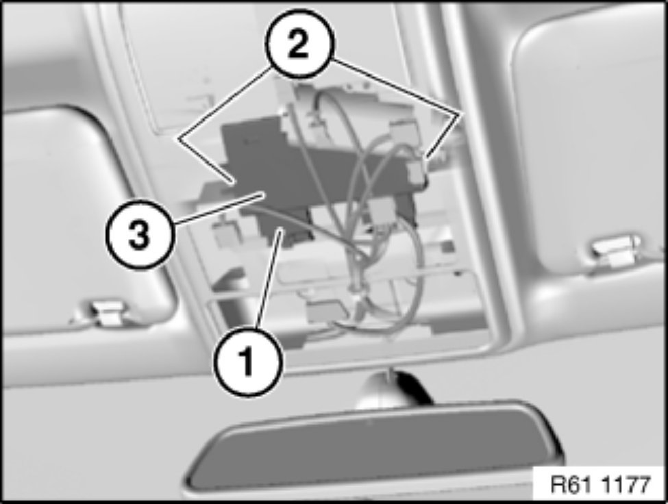 Unlock and disconnect plug connections (1) and remove control unit for slide/tilt sunroof (3).
