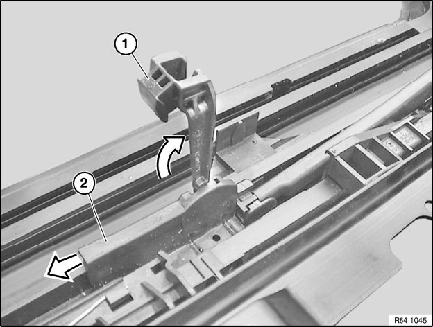 If necessary, slide drive cable plate (2) towards rear and remove from guide rail.