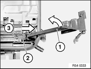 Slide control rail (1) backwards, lifting the linkage (2) and lifting lever (3) over the gasket (4).