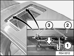 Lift out left/right spring (1) and pull wind deflector (2) backwards slightly to remove from mount (3).