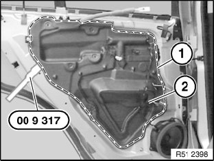 Using special tool 00 9 317 (trim panel wedge), lever out sealing bead (1) of sound insulation (2) completely or if necessary partially.