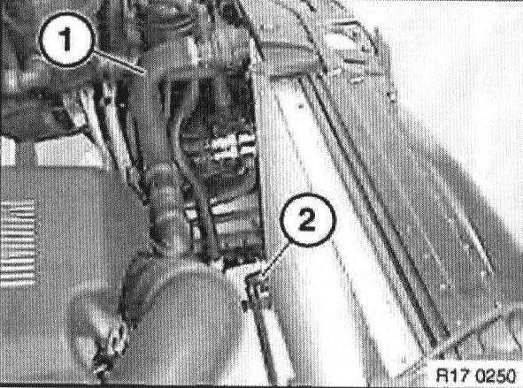 Remove heat exchanger (2) for automatic transmission fluid from mounting plate on radiator.