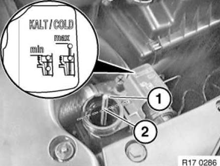 Fluid level is O.K. when top edge of coolant expansion tank is between both markings (1 and 2) on float needle.