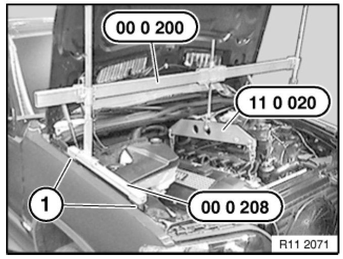 Secure special tool 11 0 020 to front and rear engine suspension eyes.