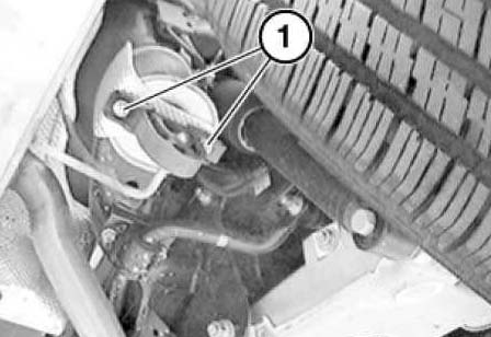 Release screws (1) on rubber mount for rear muffler on rear axle carrier.