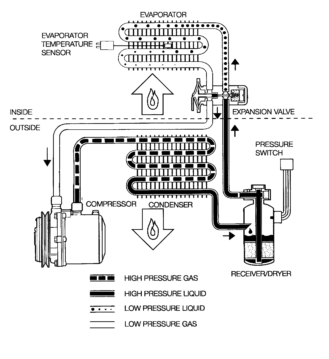 The air conditioning system is a self contained system, completely sealed off from the atmosphere. While operating, it recycles refrigerant through the system