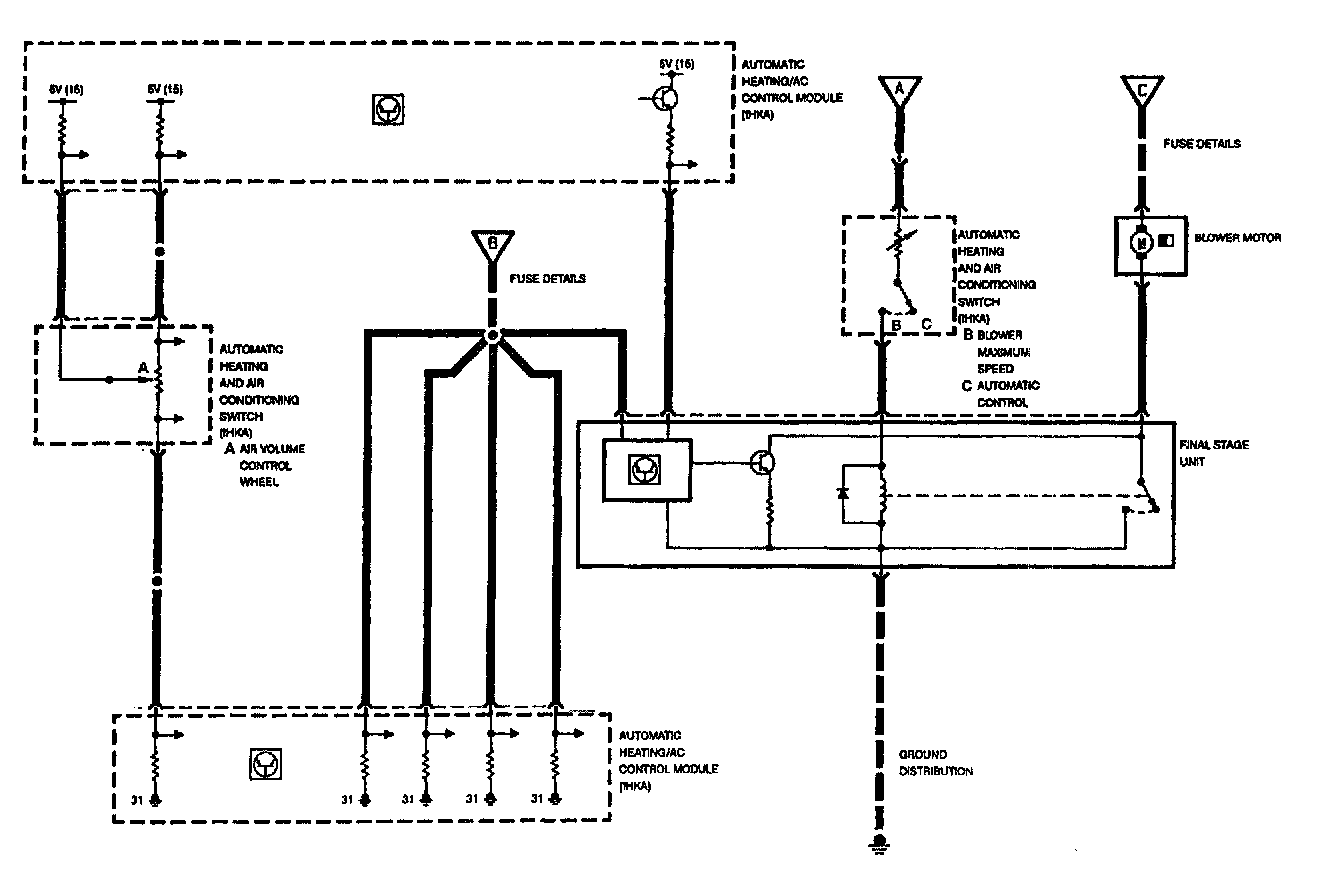 Blower control operation is in operation with the ignition switched on (KL15). The blower speed is controlled by regulating (varying) the ground circuit through the use of transistors (final stage unit).