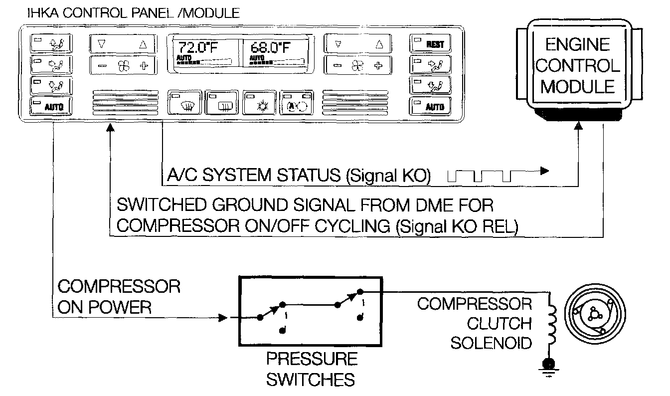 The IHKA module monitors the full load input from the ECM. It the ECM detects "full load" conditions, it signals (KOREL) the IHKA control module to disengage the A/C compressor. The conditions for full load are: