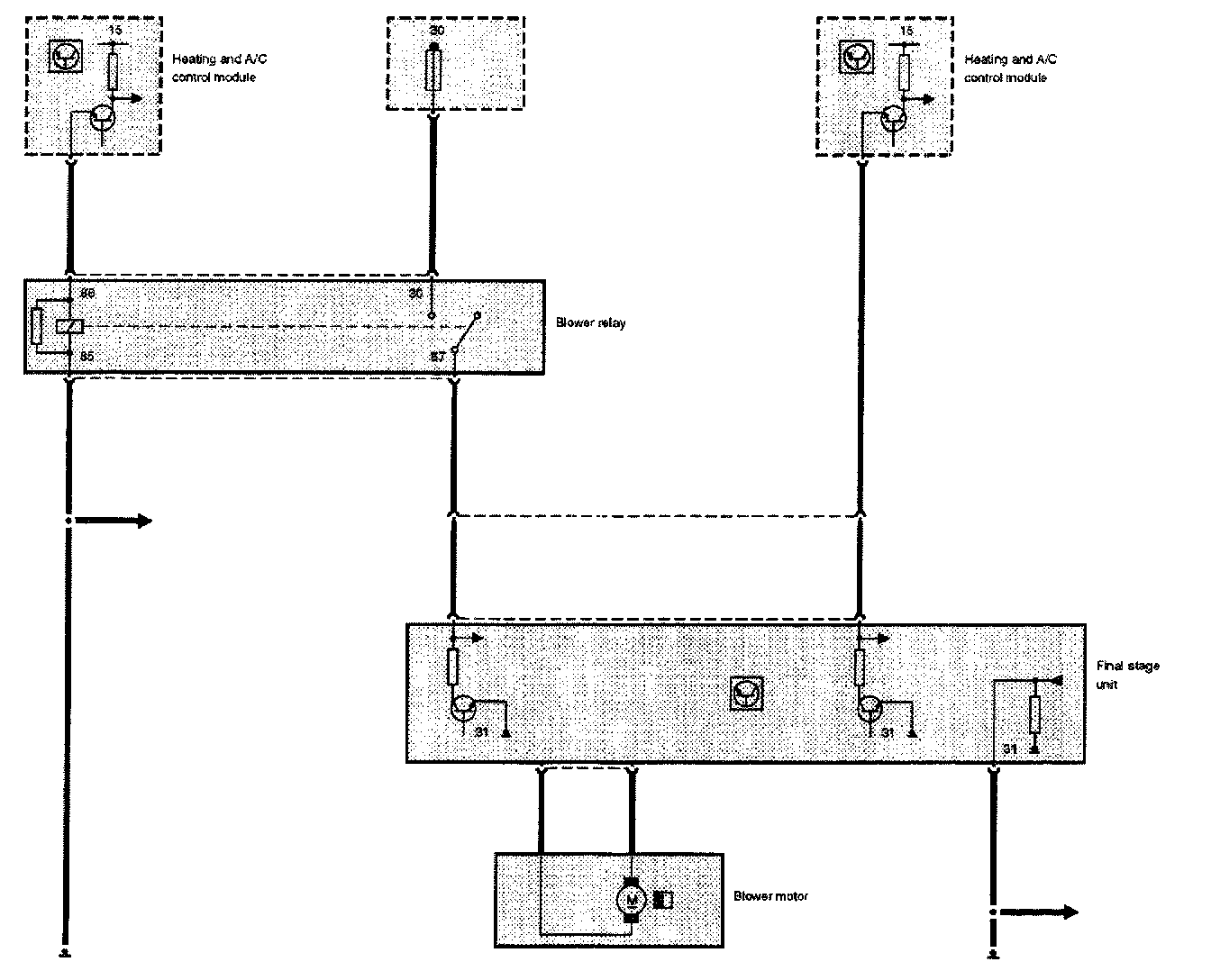 The blower speed is controlled by the IHKA control module regulating (varying) the ground circuit through the use of transistors (final stage unit).