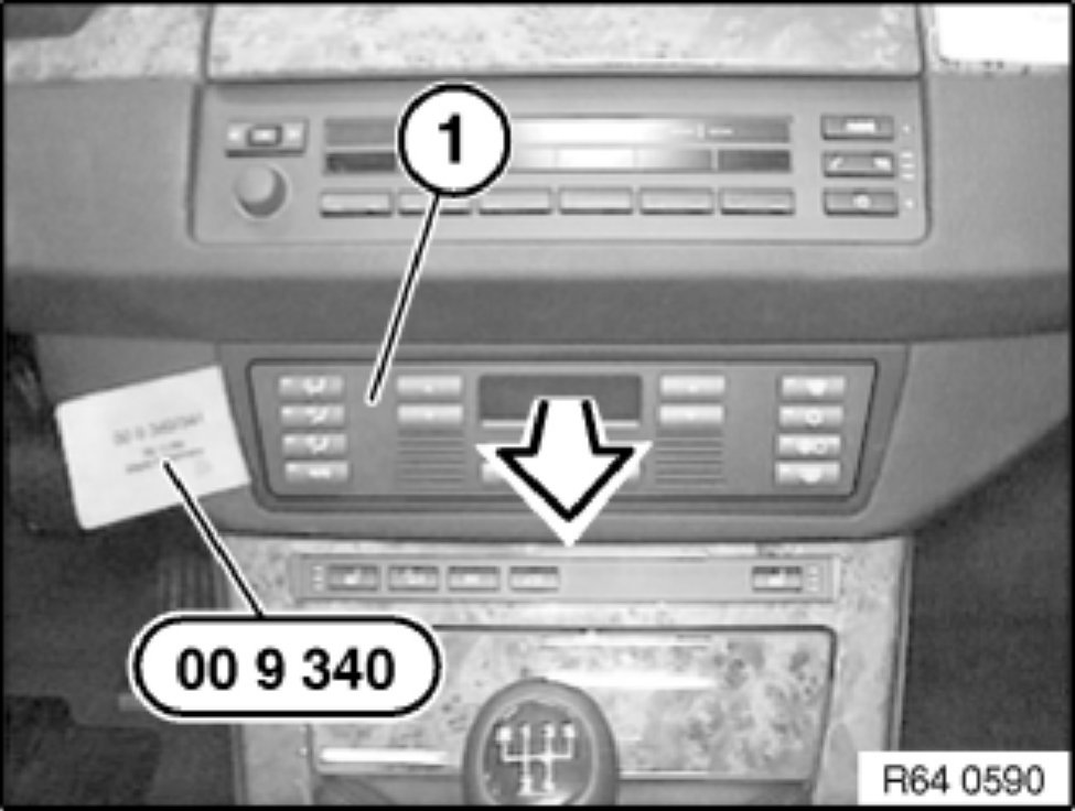 Unlock heating controls (1) with special tool 00 9 340 and pull out in direction of arrow.