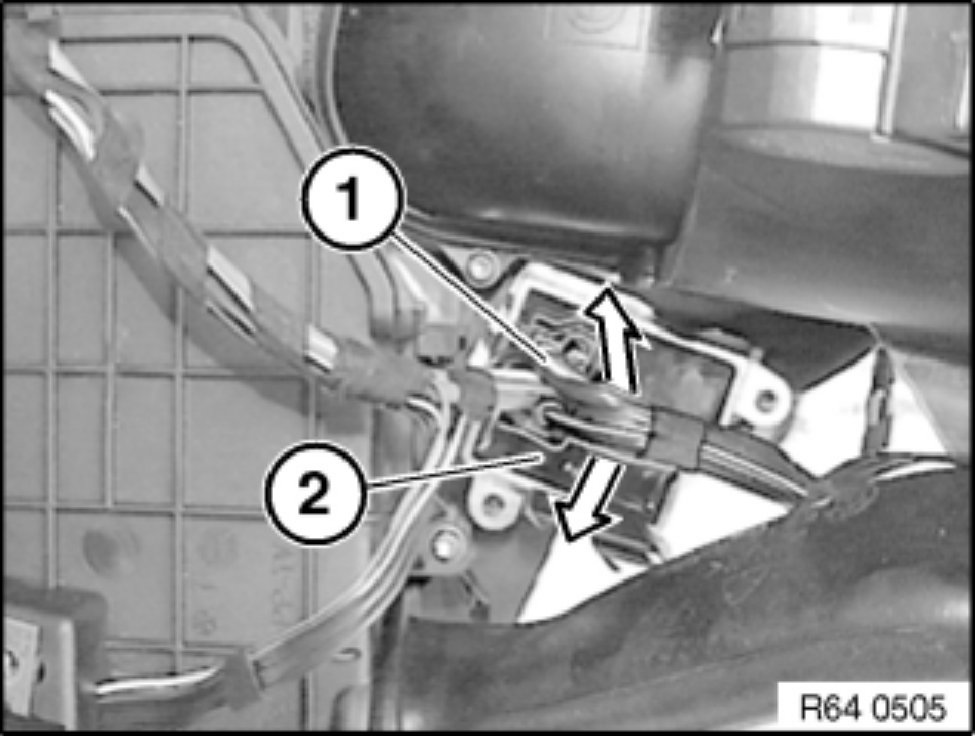 Press lock in direction of arrow and remove output stage/switch for heater - A/C system blower (2).