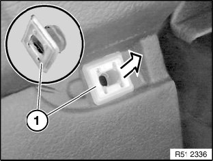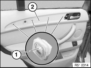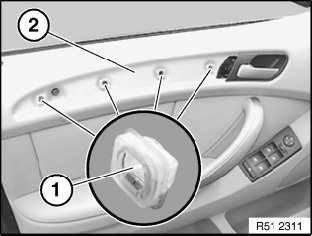If necessary, replace faulty grommets (1) on door trim panel (2).