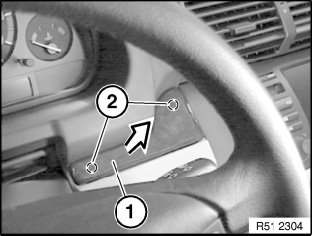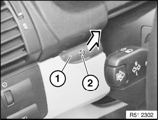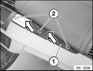 Insert special tool 00 9 321 (fishbone) at side and unclip decorative strip (1) next to retaining pin (2).