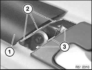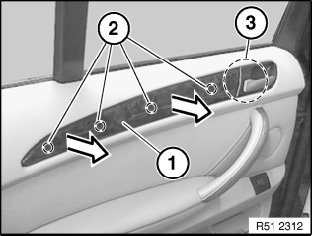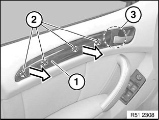 At front in area (3) of inside door handle, pull decorative strip (1) out of guides.