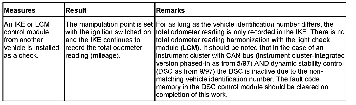 Display of the total distance covered is a component part of the LC display. The current mileage is indicated on the display from terminal R "ON". With terminal R "OFF", pressing and releasing the instrument cluster button displays the mileage for approx. 25 seconds. The unit of distance (km/miles) dependent on the coded country-specific version is displayed next to the trip recorder. The total distance is provided in the form of a telegram on the instrument bus (I-bus) and body bus (K-bus).