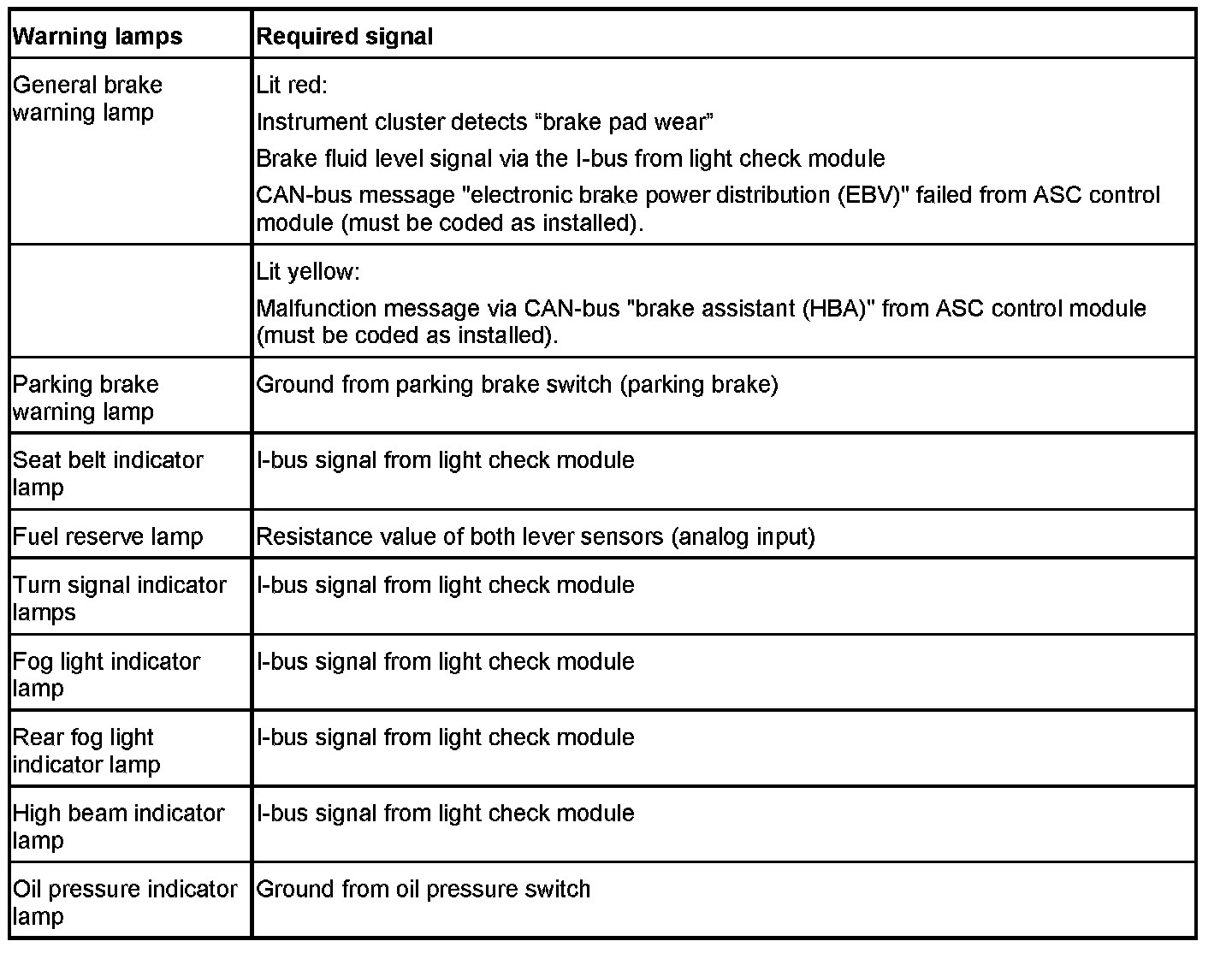 NOTE: All warning lamps not listed have no functional relationship with the instrument cluster electronics (IKE). They are only supplied with positive or negative from the display unit of the instrument cluster.